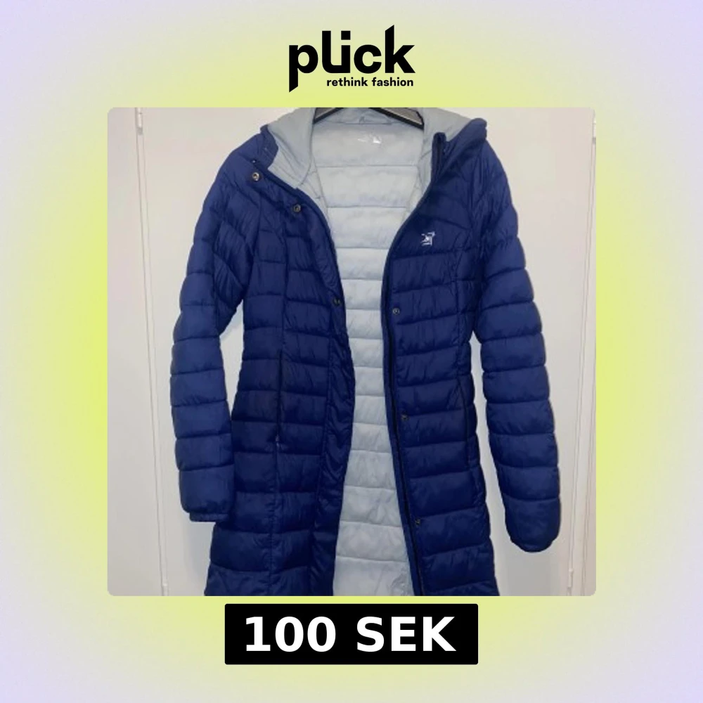 Snygg lång blå dunjacka. Jackan har dragkedja och tryckknappar framtill samt ljusgrått innerfoder.