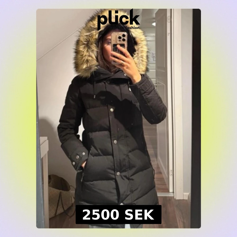 Säljer en svart lång dunjacka med huva och fuskpälsdetalj. Jackan har dragkedja och knappar framtill, fickor med dragkedja och ribbade muddar vid ärmsluten. Puffig modell som håller dig varm under kalla dagar. Märke syns på ärmen.