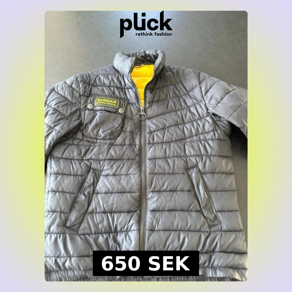Säljer en svart dunjacka från Barbour International med quiltad design och gul innerfoder. Jackan har hög krage, två snedställda fickor med dragkedja och en bröstficka med Barbour-logga. Perfekt för kalla vinterdagar eller vårdagar. Fläckfri, den enda skavanken är på innerfickan, syns ej utåt.