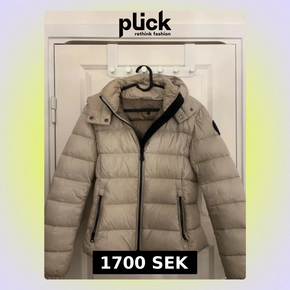Beige dunjacka från Save The Duck i S/XS, luvan går att ta av! Vatten resistant och varm så perfekt till höst/vinter. Nypris 2200kr