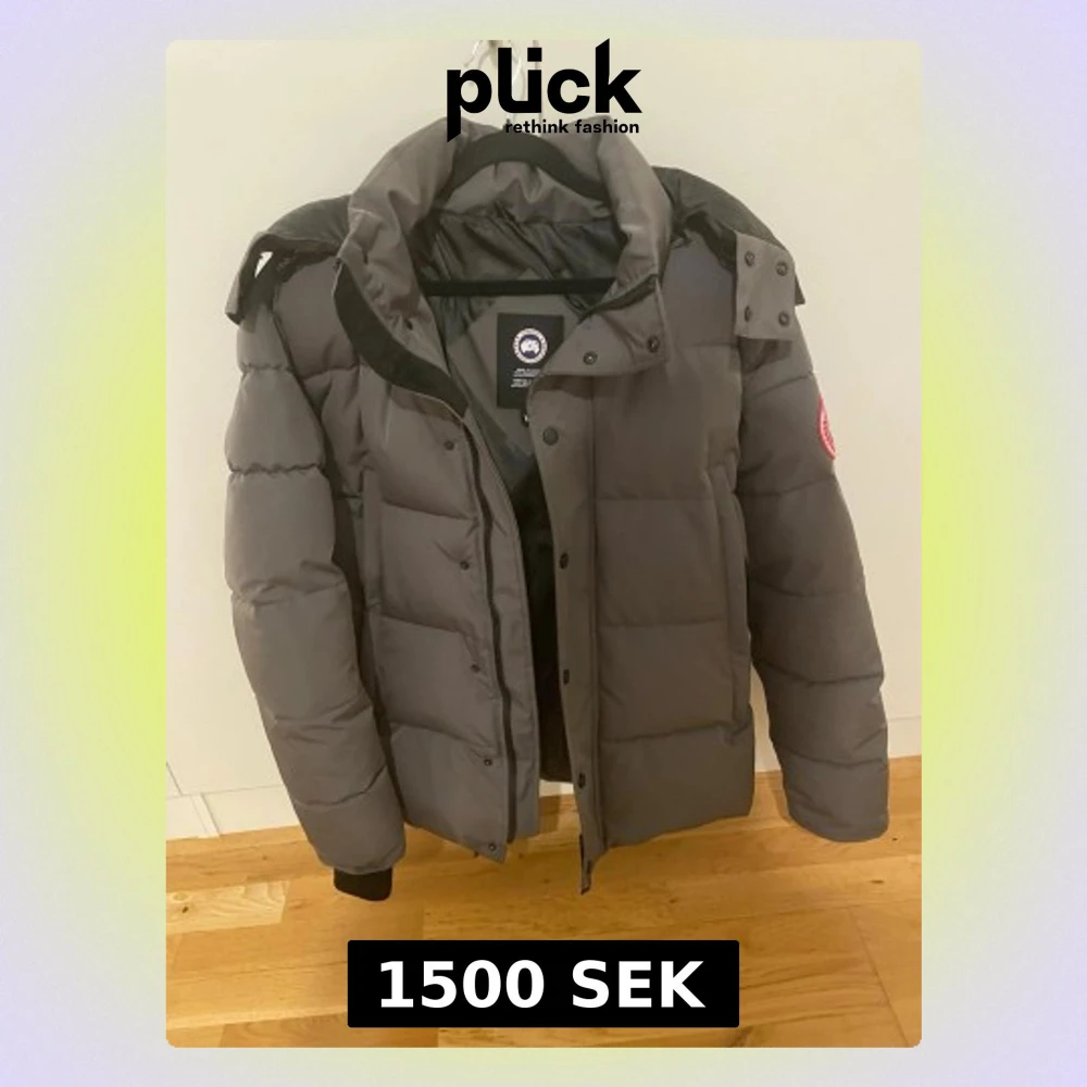 Säljer en grå dunjacka från Canada Goose med avtagbar huva och klassisk patch på ärmen. Jackan har en puffig design, dragkedja och knappar framtill samt muddar vid ärmsluten. Perfekt för kalla vinterdagar och riktigt varm.