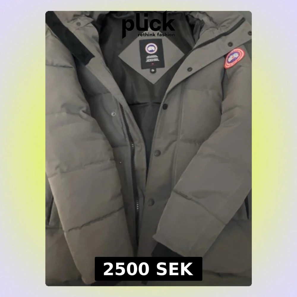 Säljer en grå dunjacka från Canada Goose med klassisk patch på ärmen och huva. Jackan har en rak passform, dragkedja och knappar framtill samt ribbade muddar vid ärmsluten. Perfekt för kalla vinterdagar och riktigt varm tack vare dunfyllningen.