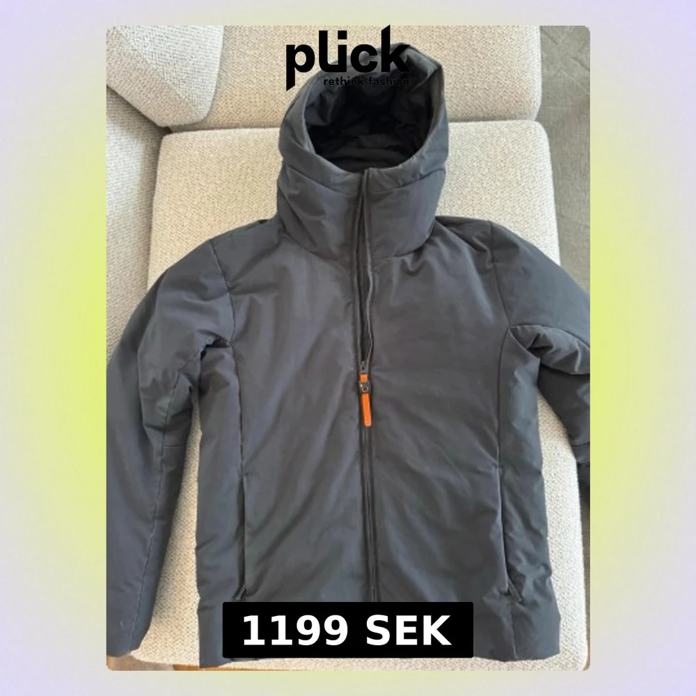 Gråblå dunjacka från Aspesi i storlek M. Lite sliten vid luvan samt ett litet hål och fläck på baksidan (se de sista bilderna).