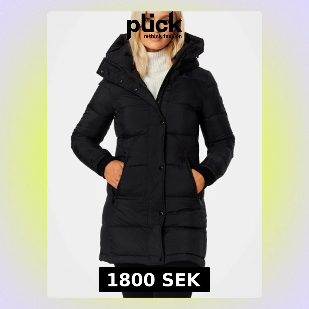 Snygg svart dunjacka med huva och dragkedja framtill. Jackan har två fickor med dragkedja och knappar vid ärmsluten. Perfekt för kalla vinterdagar och ger en stilren look. Nypris 3799 kr
