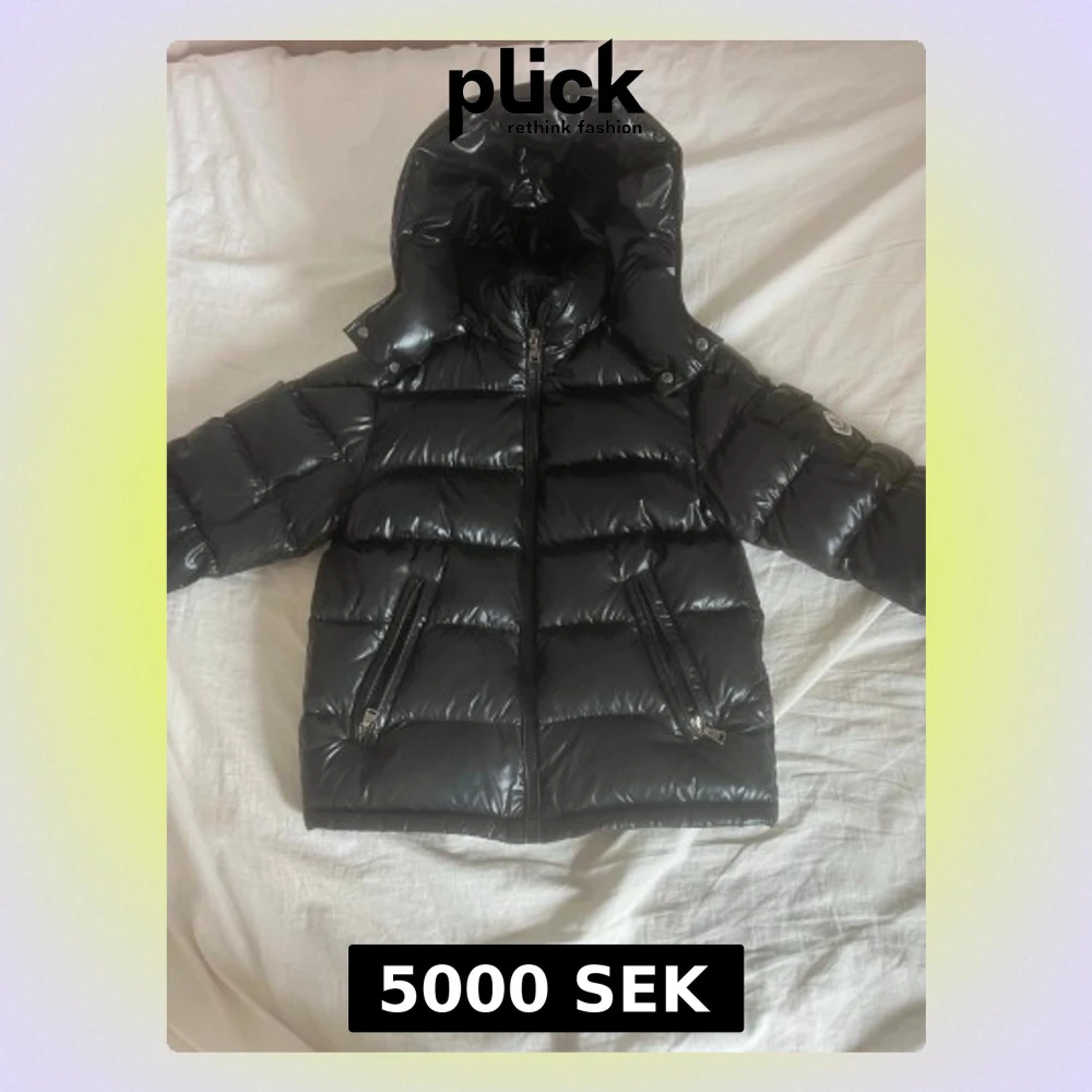 Snygg svart dunjacka från Moncler med glansig finish och stor huva. Jackan har två dragkedjeförsedda fickor framtill och Moncler-logga på ärmen. Perfekt för kalla vinterdagar och riktigt trendig look. Barn jacka typ 10 år.