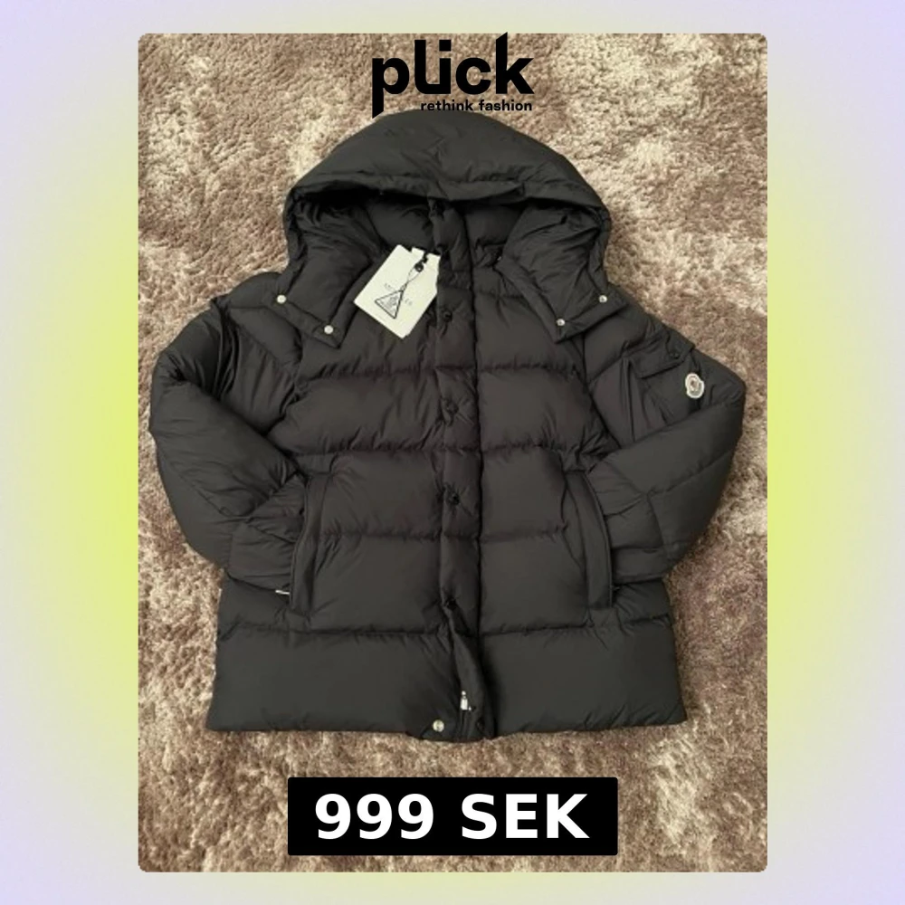 Säljer en svart dunjacka från Moncler med huva och klassisk Moncler-logga på ärmen. Jackan har två stora fickor framtill, dragkedja och tryckknappar. Perfekt för kalla vinterdagar och riktigt snygg streetstil.