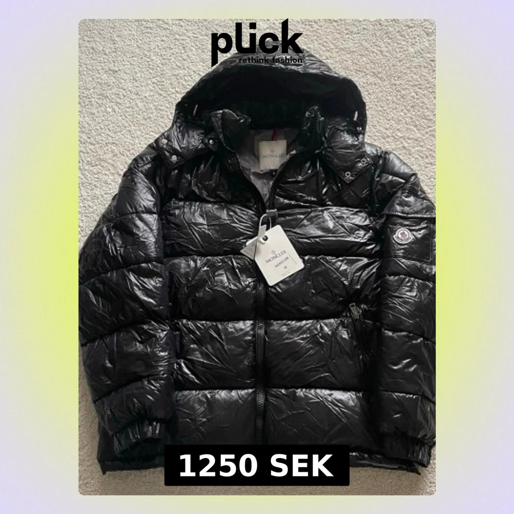 Snygg svart dunjacka från Moncler med glansig finish och huva. Jackan har dragkedja framtill, två sidofickor och Moncler-logga på ärmen. Perfekt för kalla vinterdagar och riktigt trendig stil.