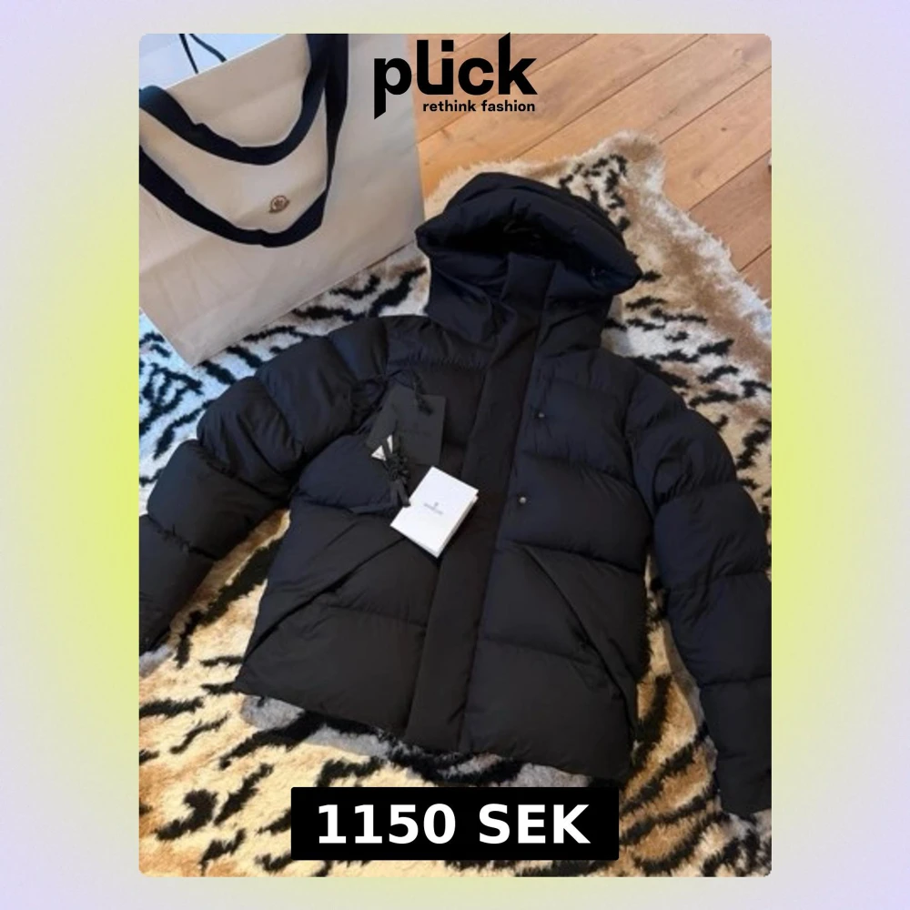 Snygg svart dunjacka från Moncler med stor huva och breda, vadderade paneler. Jackan har diskret Moncler-logga på ärmen och präglad Moncler-text längs dragkedjan. Perfekt för kalla vinterdagar och riktigt trendig look.