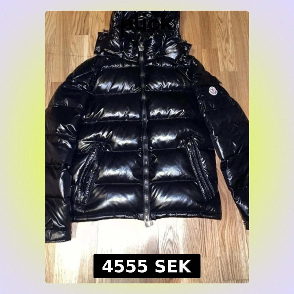 Säljer en svart, glansig dunjacka från Moncler med huva och två snedställda fickor med dragkedja. Helt äkta såklart