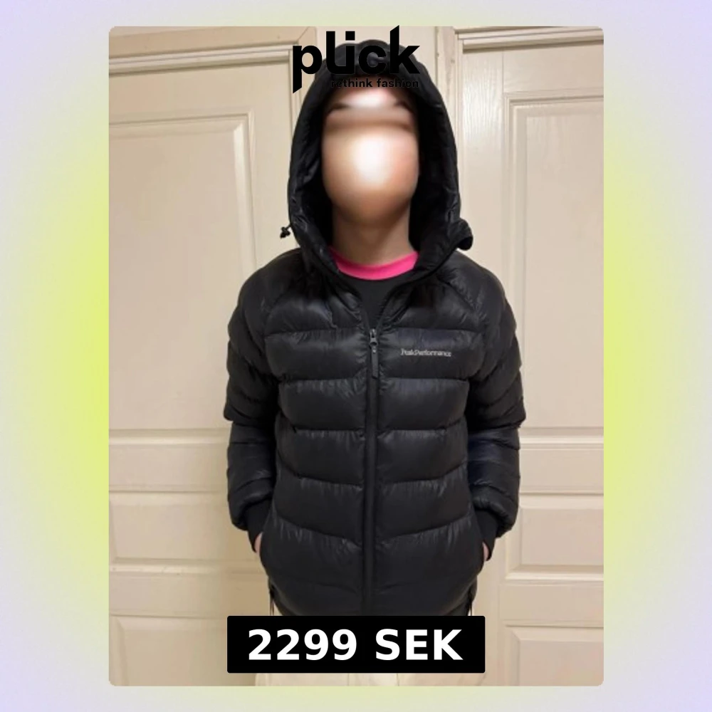 Säljer en svart dunjacka från Peak Performance med huva och dragkedja framtill. Jackan har en puffig design, två sidofickor och diskret logga på bröstet. Perfekt för kalla vinterdagar och riktigt skön att bära.