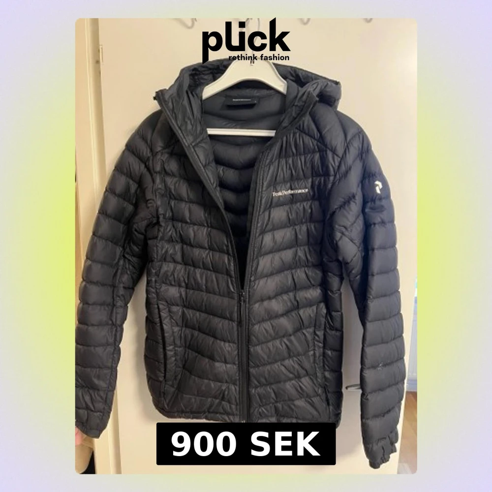 Snygg svart dunjacka från Peak Performance med huva och dragkedja framtill. Jackan har diskret logga på bröstet och är quiltad för extra värme. Perfekt för kalla vinterdagar och har en modern, sportig look.