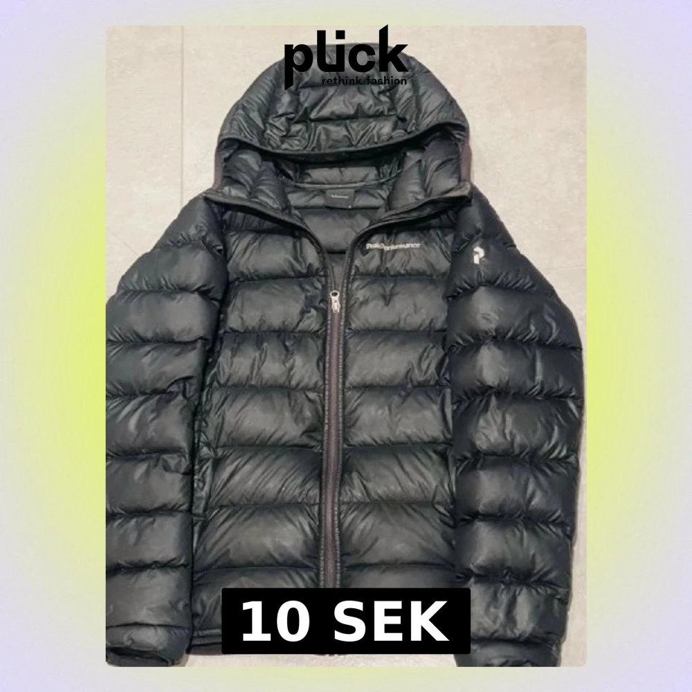 Snygg svart dunjacka från Peak Performance med huva och dragkedja framtill. Jackan har quiltad design, diskret logga på bröstet och en ficka på ärmen. Perfekt för kalla vinterdagar och riktigt skön att bära.