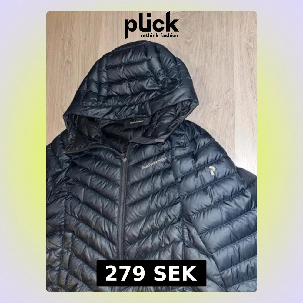 Snygg svart dunjacka från Peak Performance med huva och dragkedja framtill. Jackan har ett quiltat mönster och logga på bröstet samt ärmen. Perfekt för kalla vinterdagar och riktigt lätt att bära.