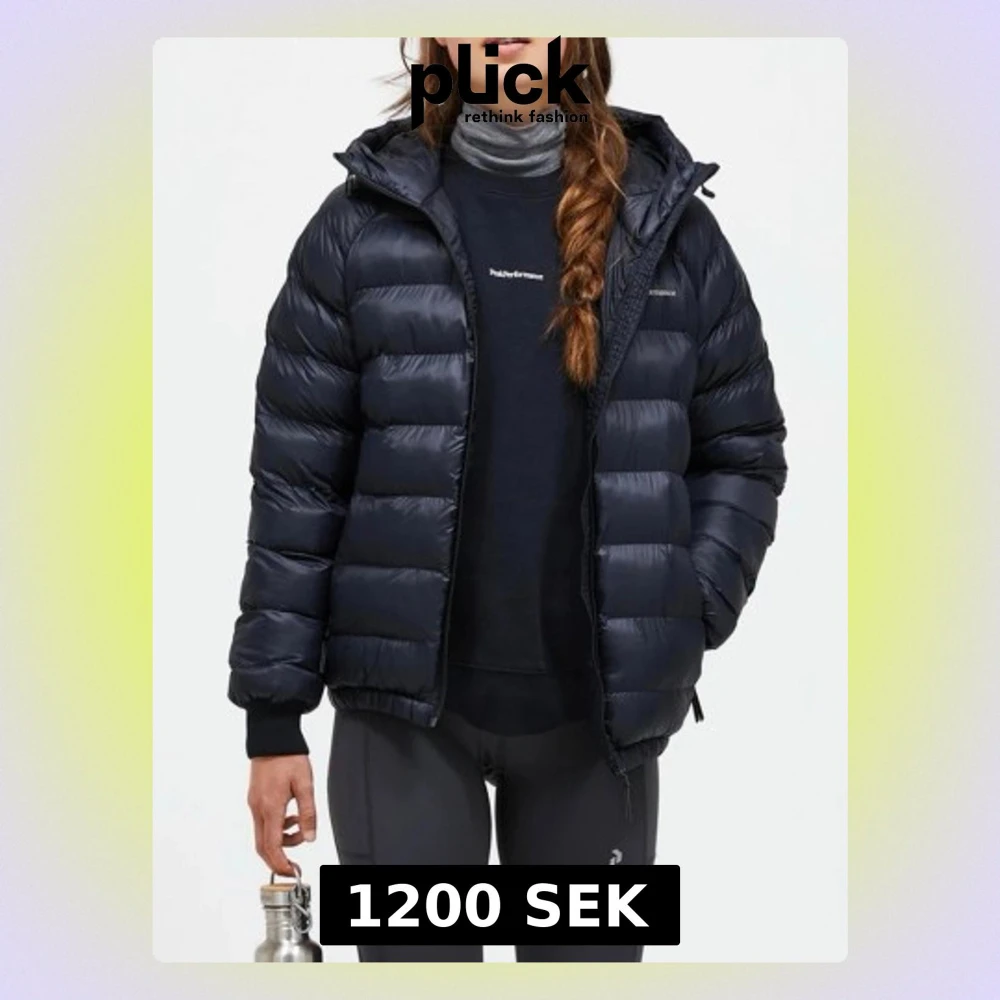Snygg svart dunjacka från Peak Performance med huva och dragkedja framtill. Jackan har en puffig design med breda kanaler och logga på bröstet. Perfekt för kalla vinterdagar och riktigt varm tack vare dunfyllningen. Har inte använt det och köpte den för 2200kr och säljer för 1200 kr