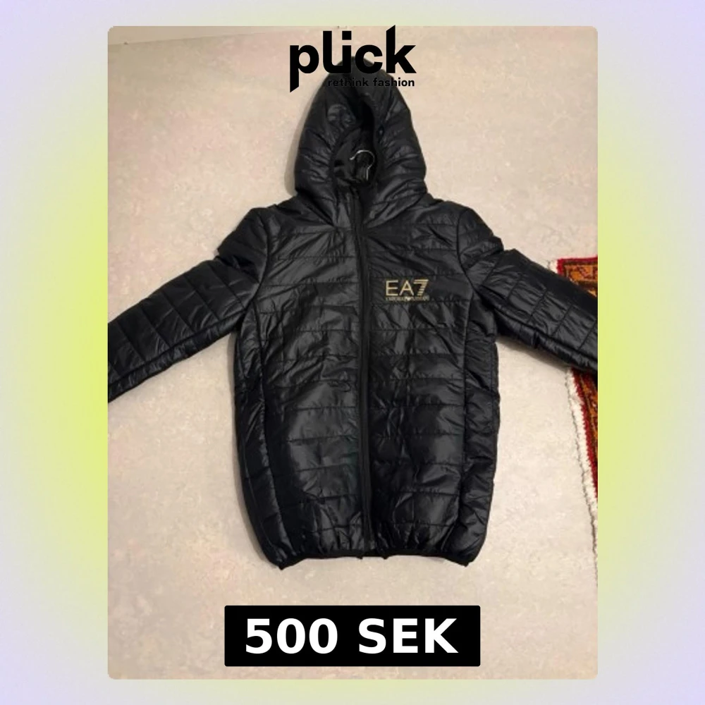 Svart dunjacka EA7 Emporio Armani - Snygg svart dunjacka från EA7 Emporio Armani med huva och dragkedja framtill. Jackan har ett quiltat mönster och logga på bröstet. Har ett litet hår på ryggen men är inget som syns.