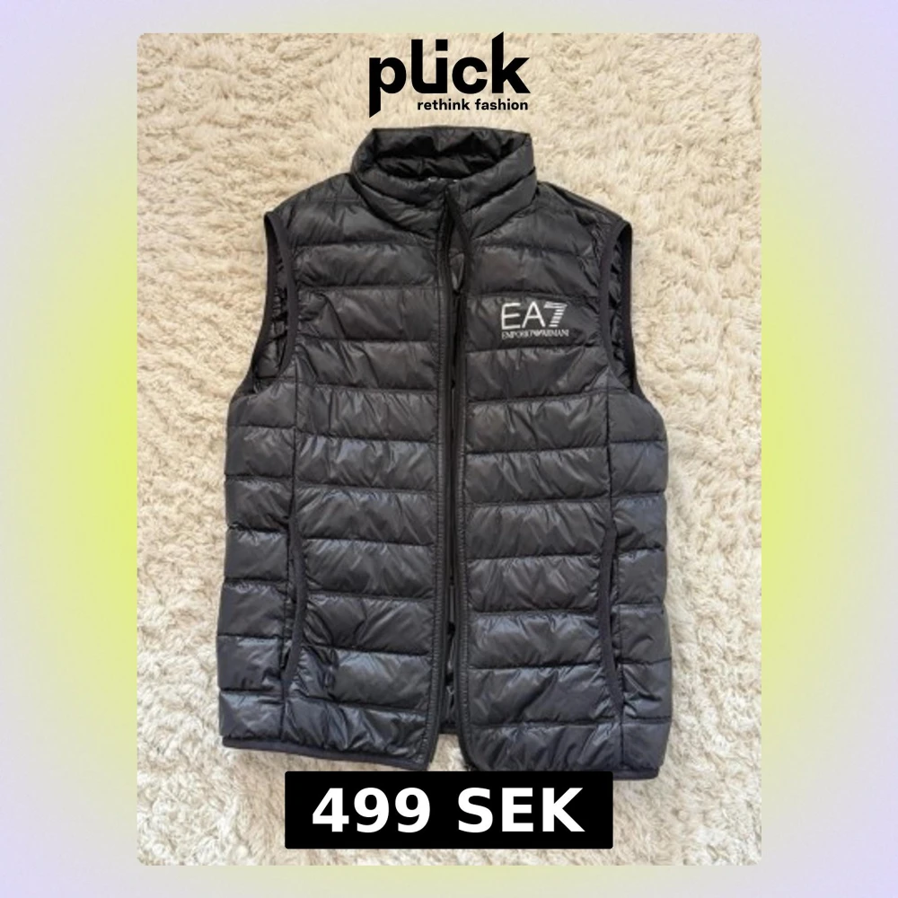 Snygg svart dunväst från EA7 Emporio Armani med quiltad design och hög krage. Västen har dragkedja framtill och logga på bröstet. Perfekt för lager-på-lager och ger en sportig vibe till din outfit. Ny pris ca 2000kr, hör av dig om du vill diskutera pris!