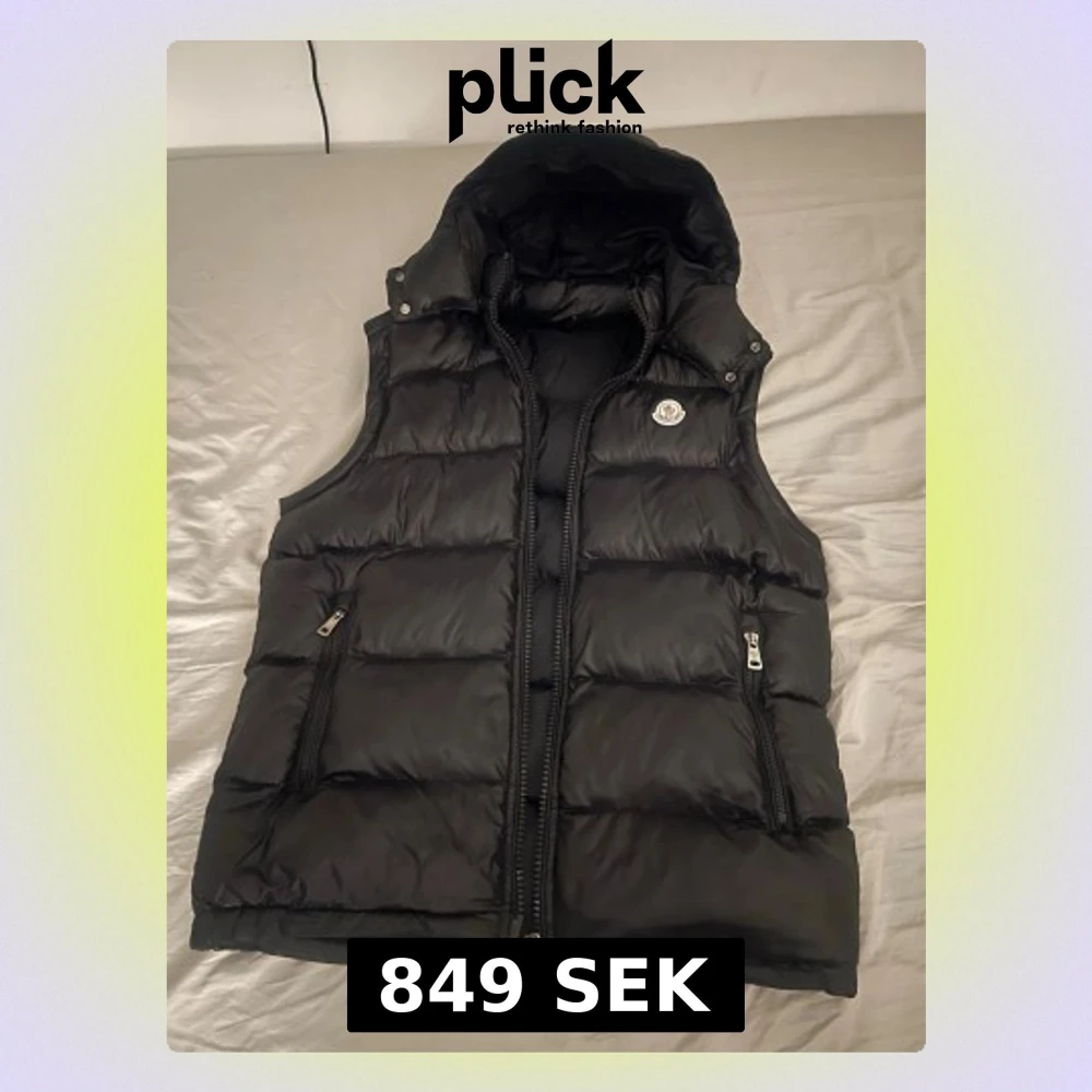 Snygg svart dunväst från Moncler med avtagbar huva och två dragkedjeförsedda fickor. Västen har klassisk Moncler-logga på bröstet och quiltad design. Insidan har etiketter och ett coolt serietidningsmönster. Perfekt för lager-på-lager och streetstyle.
