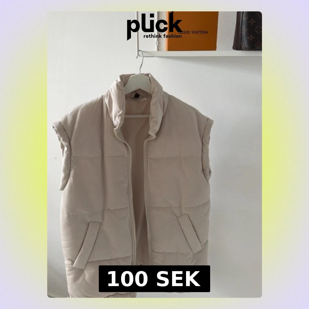 Stilren beige dunväst med hög krage och dragkedja framtill. Västen har två snedställda fickor och quiltad design som ger en puffig look. Perfekt att slänga över en hoodie eller tröja för extra värme. Materialet är mjukt och ger en clean vibe.