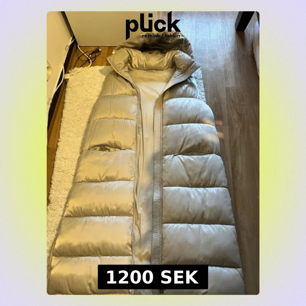Lång, beige dunväst från Massimo Dutti med stor huva och quiltad design. Västen har en rak passform och dragkedja framtill. Perfekt för lager på lager och ger en clean, modern look. Materialet är glansigt och känns lyxigt.