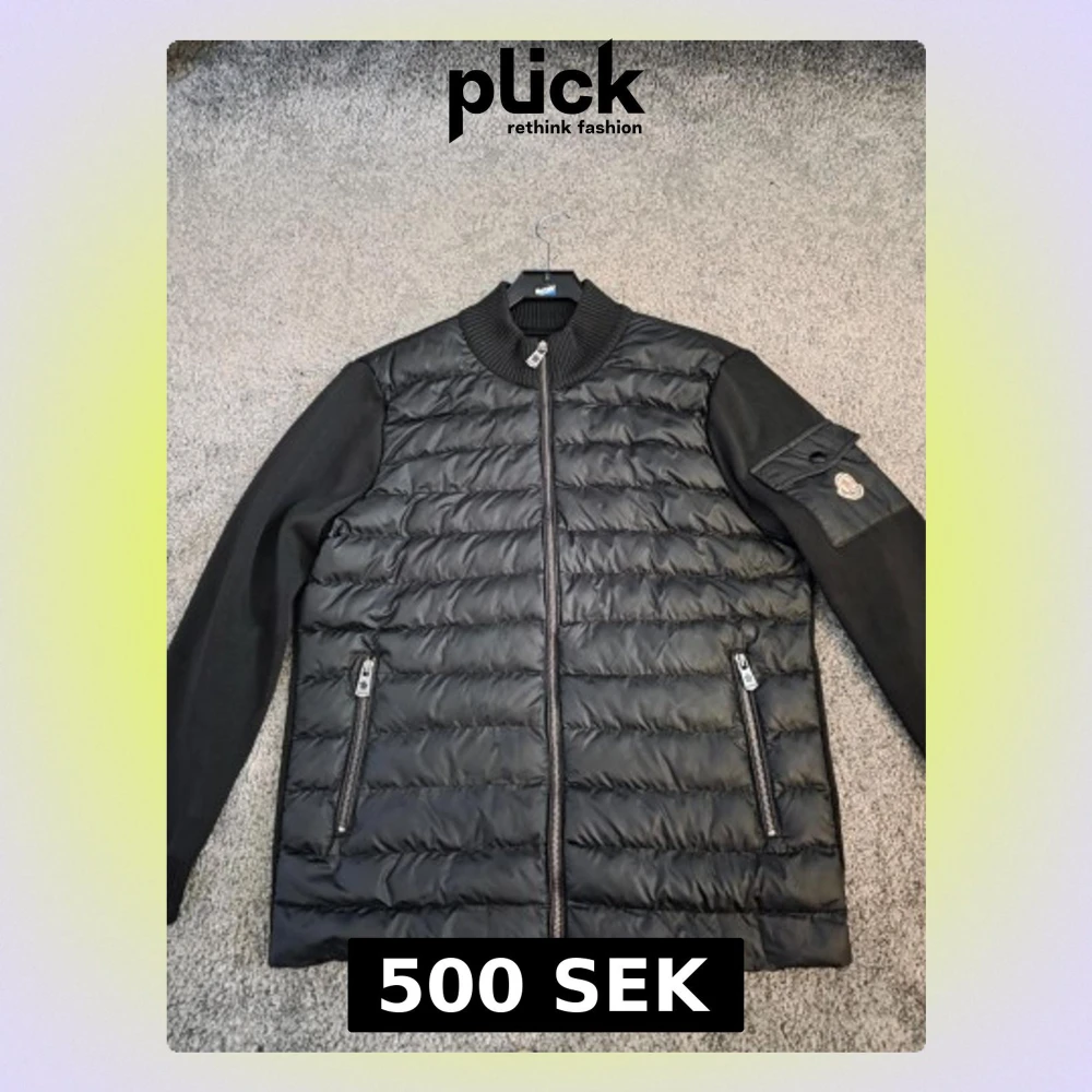 Cool svart dunväst från Moncler med quiltad framsida och stickade ärmar. Västen har två dragkedjefickor fram och en snygg Moncler-logga på ärmen. Materialet är en mix av dun och stickad textil, perfekt för att hålla värmen. Stängs med dragkedja och har ribbad krage.