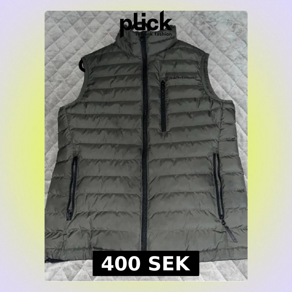 Snygg olivgrön dunväst från Peak Performance med hög krage och dragkedja framtill. Västen har två sidofickor med dragkedja och en bröstficka. Quiltad design och lätt vadderad för extra värme. Perfekt lager på lager-plagg för kyliga dagar.
