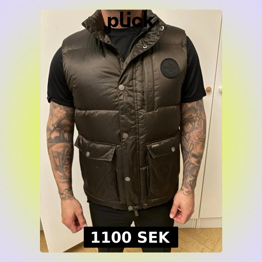 Snygg mörkbrun dunväst från Snoot med hög krage, två stora fickor med lock och tryckknappar samt en bröstficka med dragkedja. Västen har ett stilrent märke på bröstet och är tillverkad i glansigt material. Perfekt för lager-på-lager-stil. Nypriset är 3500 kr och den är i perfekt skick. Näst intill ny
