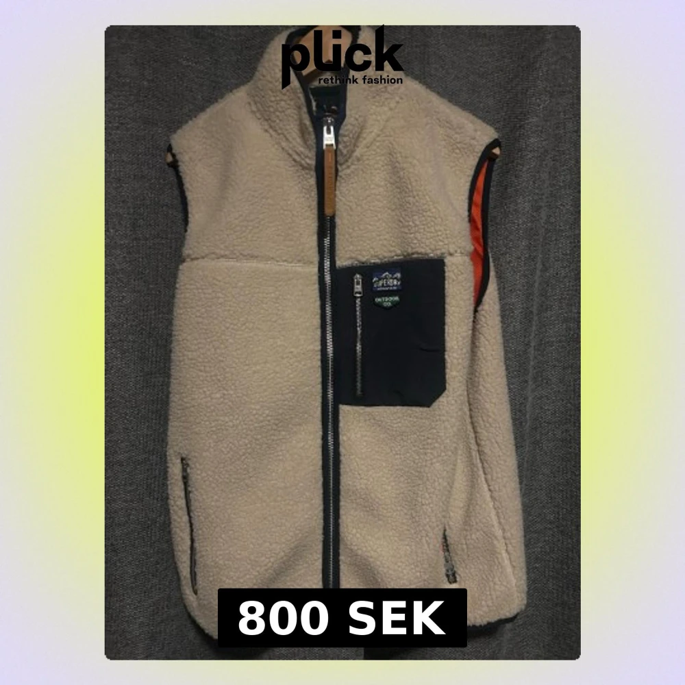 Mysig beige fleeceväst från Superdry med hög krage, hel dragkedja och kontrasterande svart bröstficka med logga. Västen har två sidofickor med dragkedja och orange detaljer på insidan av ärmhålen. Perfekt för lager-på-lager och outdoor. Helt oanvänd.
