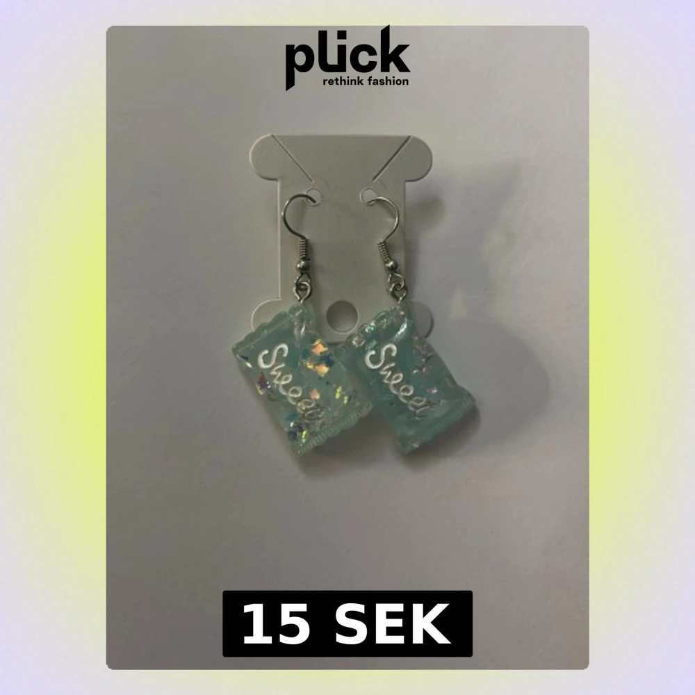 Unika örhängen i ljusblå plast med skimrande glitterdetaljer och texten 'Sweet' på varje hänge. De har en lekfull, fyrkantig form som påminner om godisförpackningar och hängs på örat med silvriga krokar. Perfekta för dig som gillar söta och färgglada accessoarer.