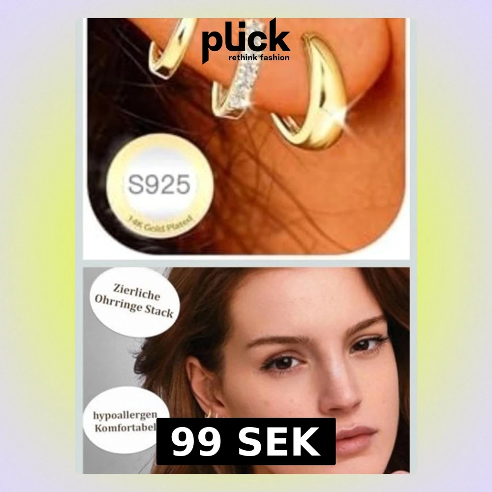 Säljer ett 3-pack huggie hoops i 18K guldpläterat 925 silver. Två par är släta och ett par är dekorerade med gnistrande stenar. Alla är små, runda och passar perfekt att stapla. Hypoallergena och bekväma att bära.