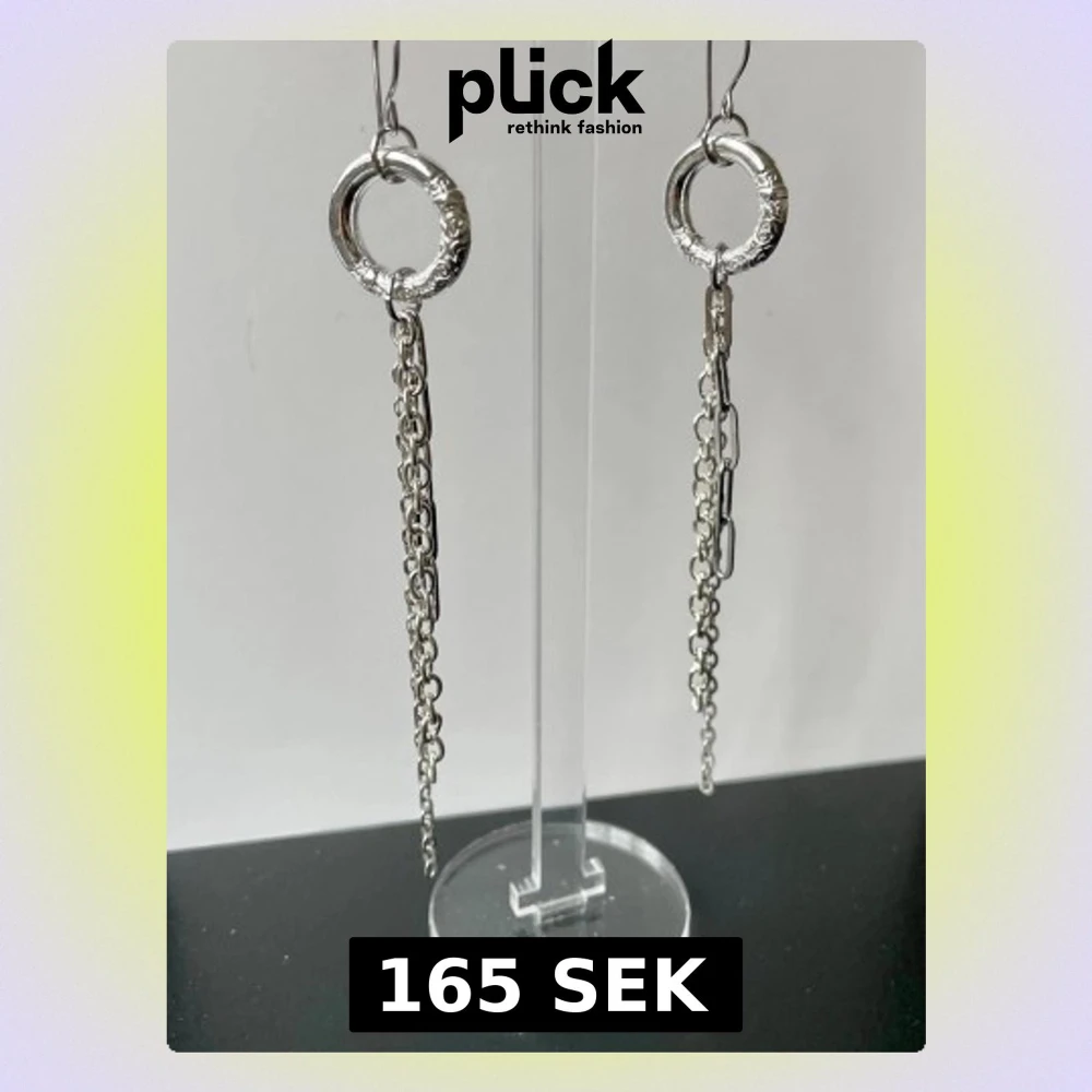 Säljer ett par trendiga örhängen i silverfärgat stål. Örhängena har en rund ring upptill och två hängande kedjor i olika längder för en edgy look. Perfekta för dig som gillar statement-accessoarer och vill sticka ut lite extra.