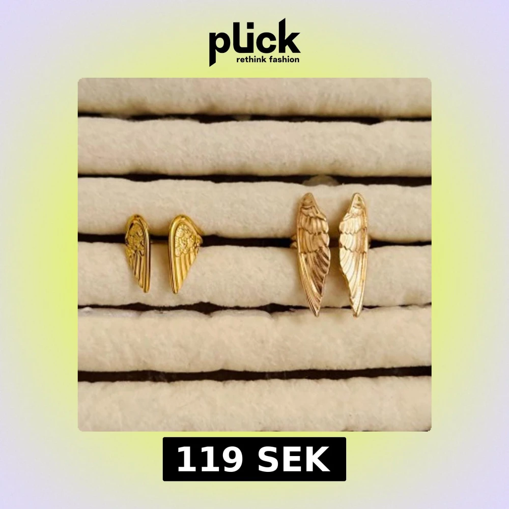 Två ringar i form av vingar i guldfärgad metall. Ena paret är mindre med detaljerade mönster, det andra paret är större och har en mer markerad fjäderstruktur. Perfekta för dig som gillar unika och trendiga accessoarer.( styck pris)