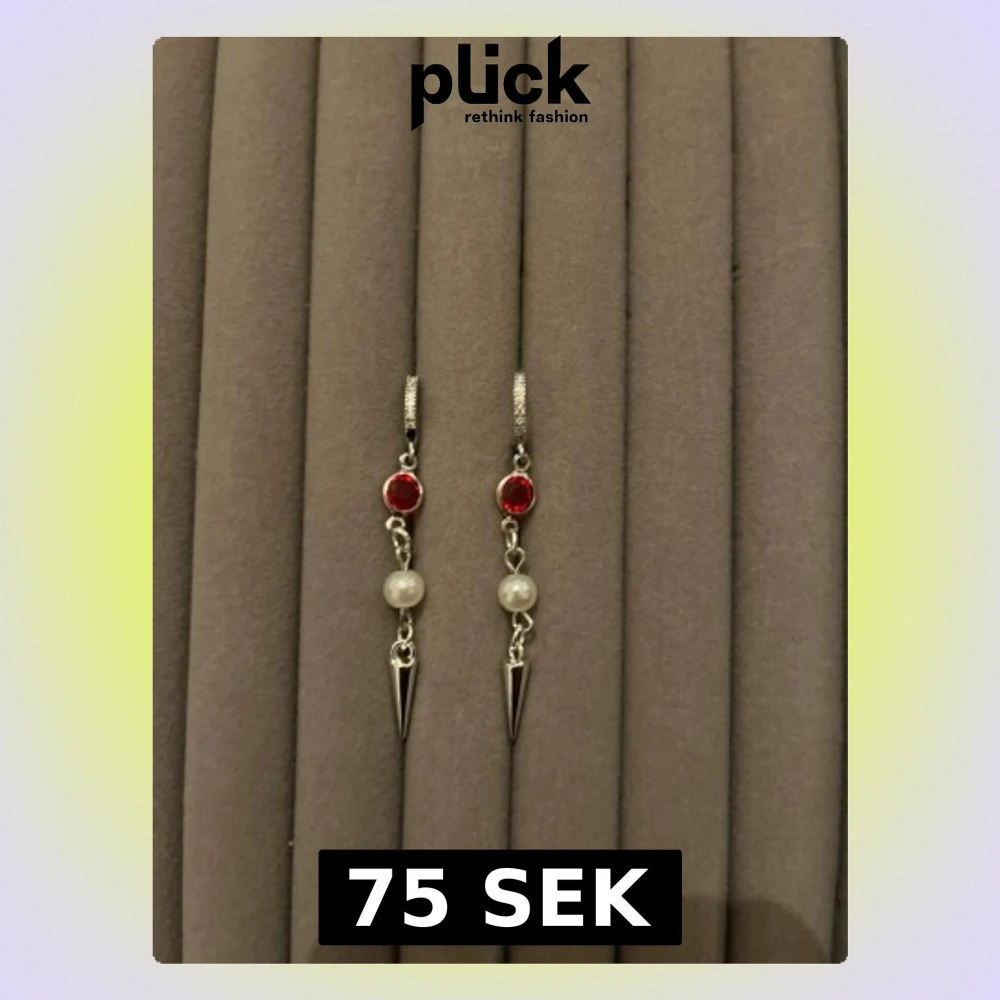 Säljer ett par unika silvriga örhängen med röd sten upptill, en vit pärla i mitten och en spetsig metallpendel längst ner. Örhängena har en cool och edgy design som sticker ut. Perfekta för dig som vill ha något annorlunda och trendigt.