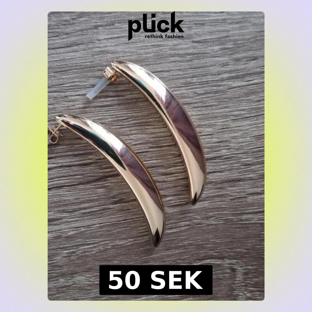 Ett par långa, lätt rundade örhängen i plast med metallicskimrande yta. Längd 5,7 cm. Oanvända från HM