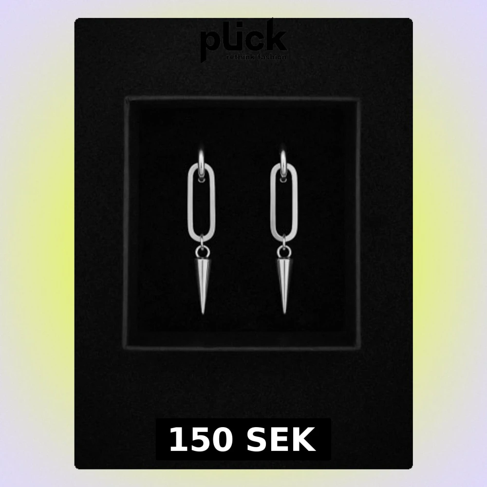 Säljer ett par stilrena silvriga örhängen med avlånga länkar och coola spike-formade hängen. Örhängena har en modern och edgy design som verkligen sticker ut. Perfekta för dig som gillar minimalistiska men ändå statement smycken.