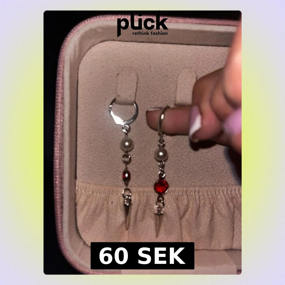 Unika silvriga örhängen med hängande detaljer, vita pärlor och en röd glittrande sten. Örhängena har även en liten metallspets längst ner för en edgy look. Perfekta för dig som vill sticka ut med accessoarerna.