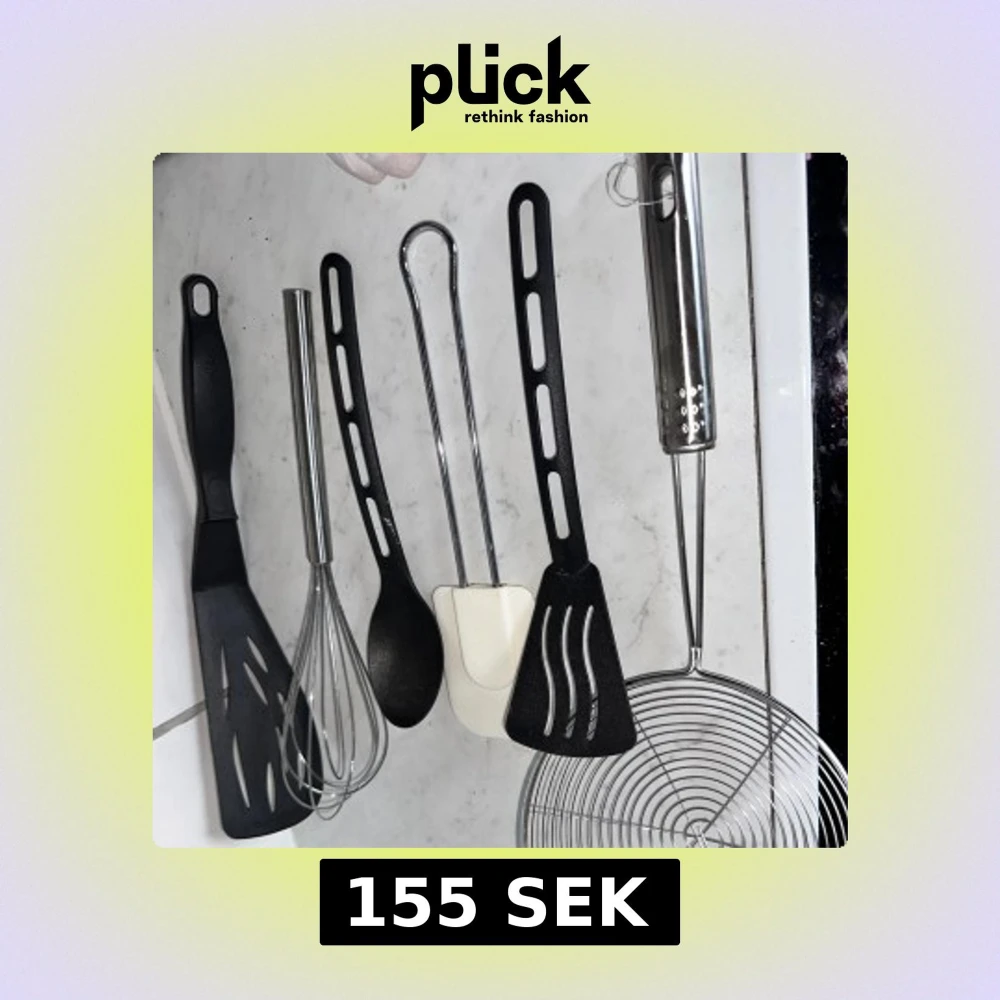 Diverse köksredskap säljes. Praktiskt set med sex köksredskap i plast och rostfritt stål. Innehåller stekspade, visp, sked, tång, slickepott och hålslev. Alla delar ser ut att vara i gott skick utan synligt slitage eller defekter. Perfekt för matlagning och bakning i hemmet.