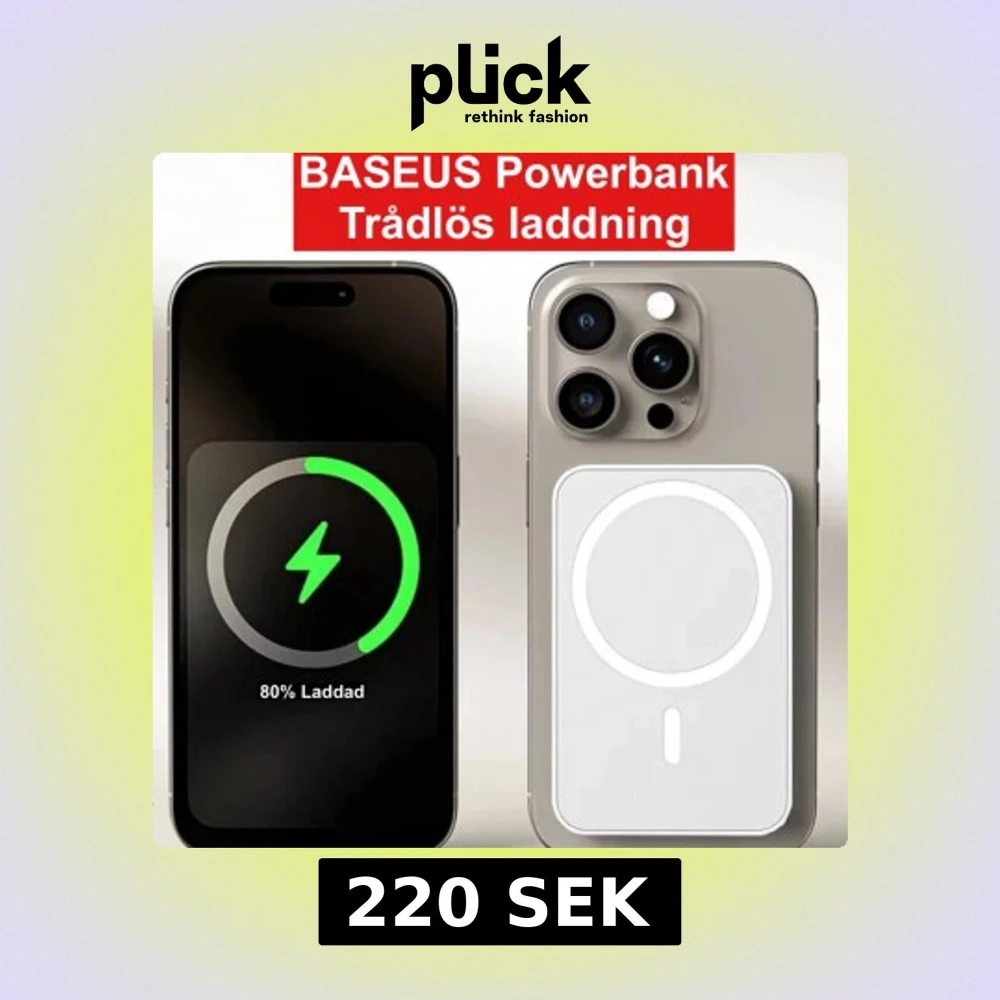 BASEUS powerbank med trådlös laddning, perfekt för MagSafe-kompatibla iPhones. Slimmad design, enkel att fästa på baksidan av mobilen. Passar utmärkt för laddning på språng. Produkten ser ut att vara i ny oanvänd. Passar alla mobiler.