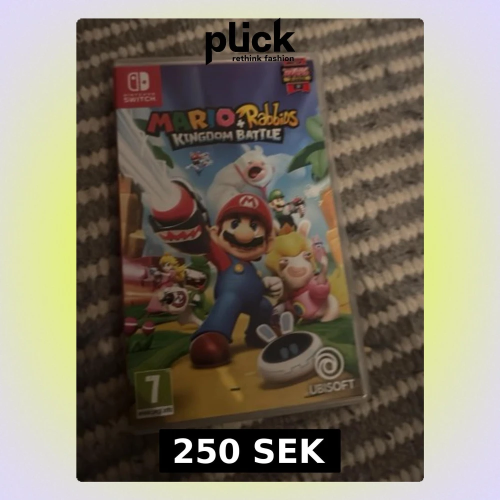 Mario + Rabbids Kingdom Battle till Nintendo Switch är ett färgglatt strategispel där Mario och Rabbids samarbetar i en galen värld. Omslaget är i plast och spelet har tecknad grafik med mycket blått, grönt och rött.