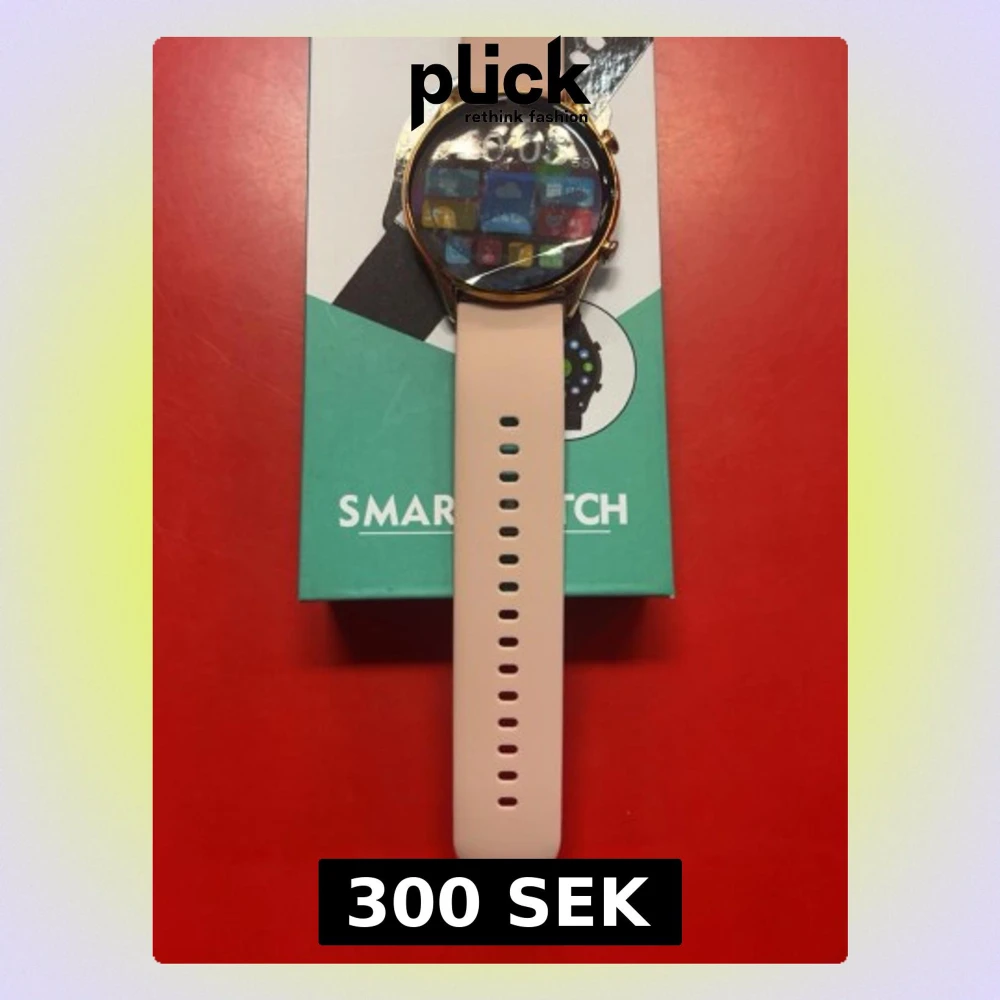 Modern smartklocka med rund pekskärm, rosa silikonarmband och guldfärgad boett. Levereras i originalförpackning. Flera hälso- och träningsfunktioner, notifikationer och pulsmätare. Ser ut att vara i mycket gott skick utan synligt slitage.