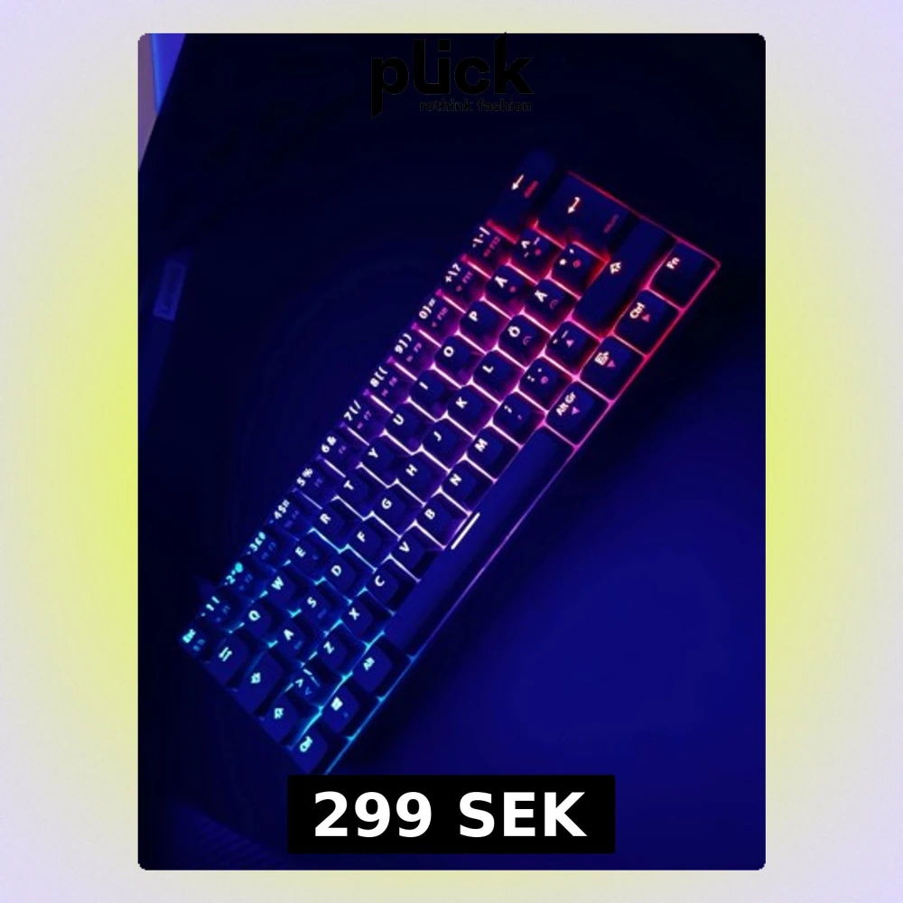 Snyggt 60% mekaniskt tangentbord med RGB-belysning i flera färger. Perfekt för gaming och skrivbord med begränsat utrymme. Tangenterna lyser starkt och jämnt, och tangentbordet ser ut att vara i mycket gott skick utan synligt slitage. Och det är en nos märke
