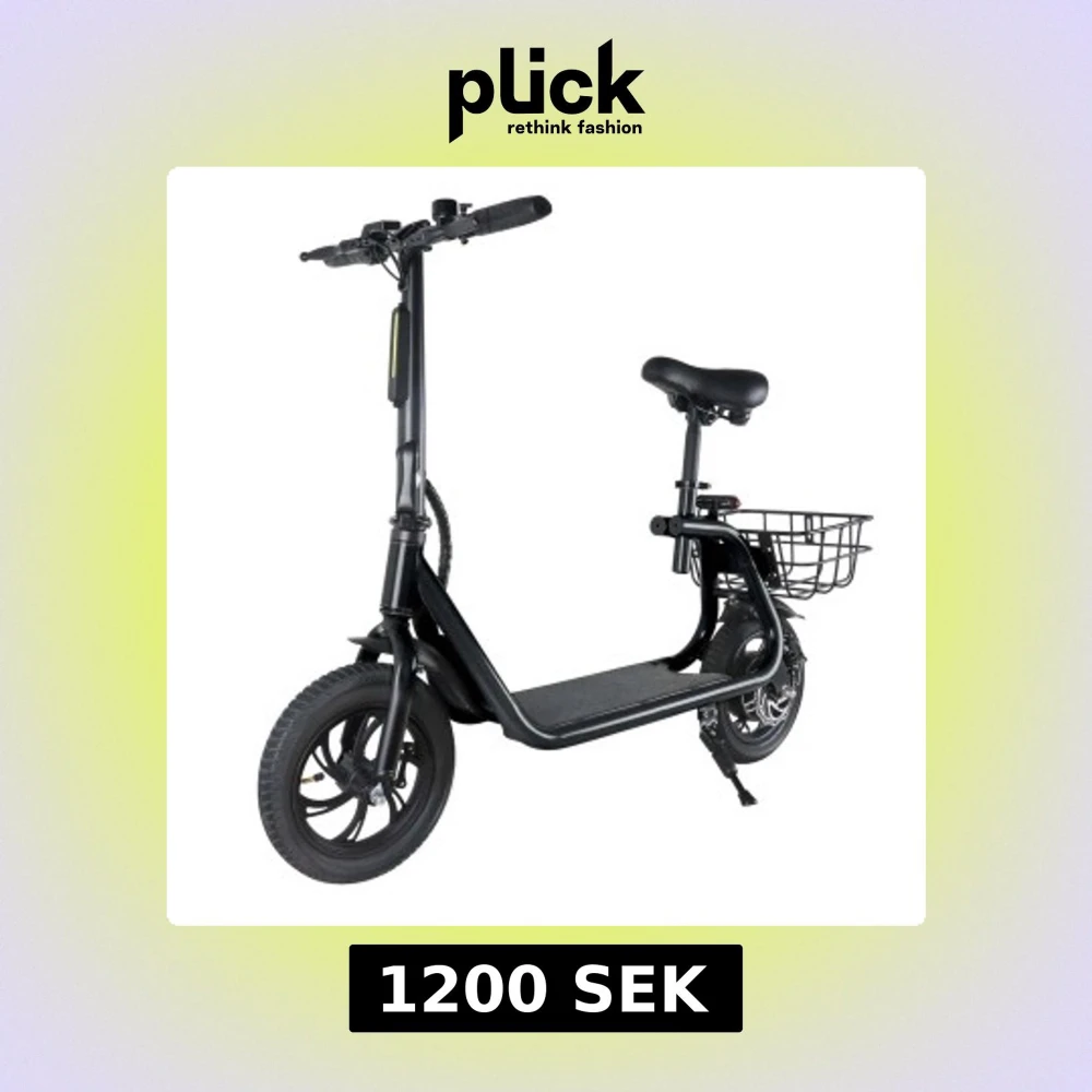 Modern elektrisk sparkcykel med bekväm sadel och praktisk bakre korg. Utrustad med robusta däck, handbroms och stöd. Perfekt för stadspendling och kortare resor. Produkten ser ut att vara i mycket gott skick synligt slitage bra till julklapp