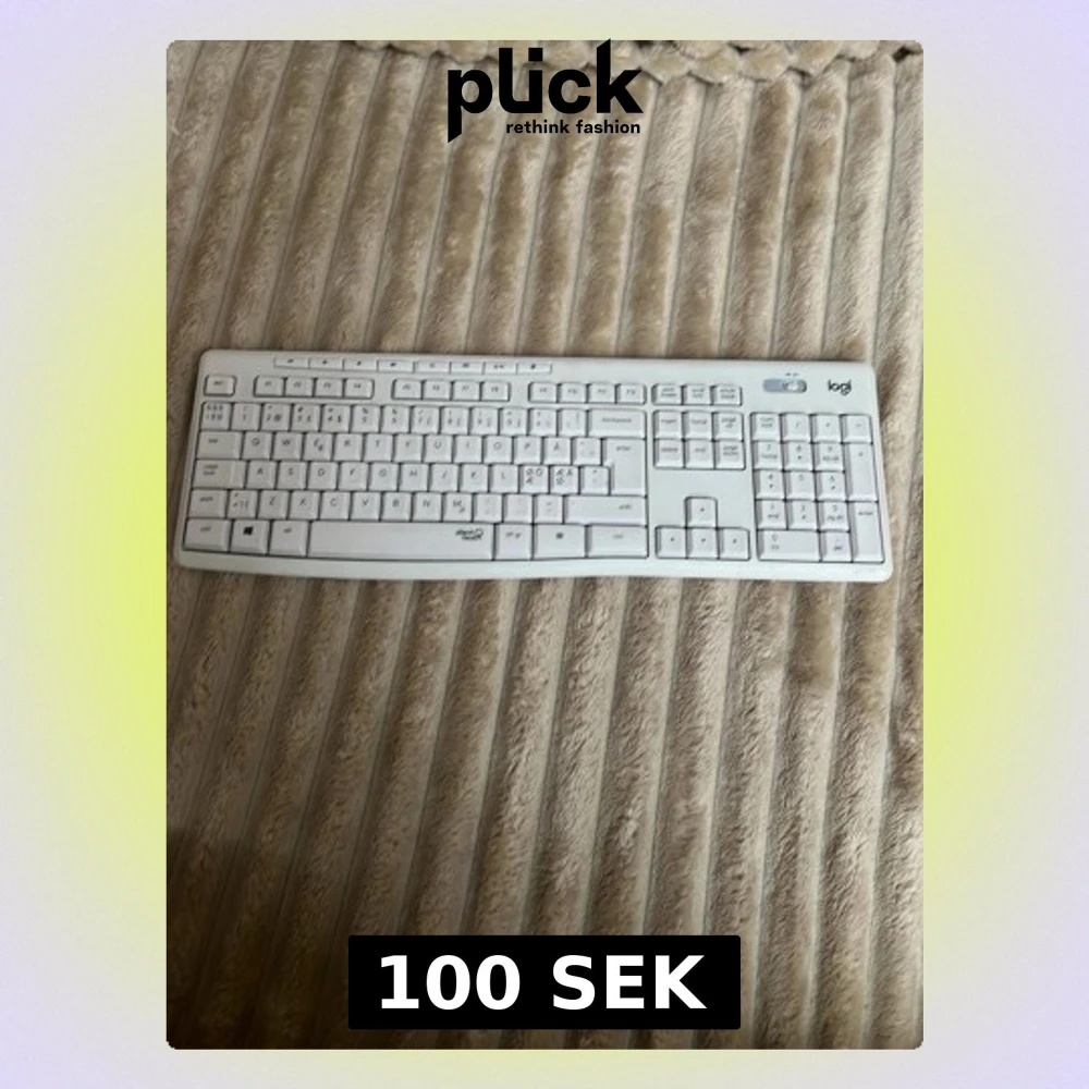 Snyggt och rent Logitech K270 tangentbord i vitt. Fullstort med numerisk del, svenska tecken och multimedia-knappar. Batterifack och USB-mottagare på baksidan. Inga synliga defekter eller slitage, ser ut att vara i gott skick.