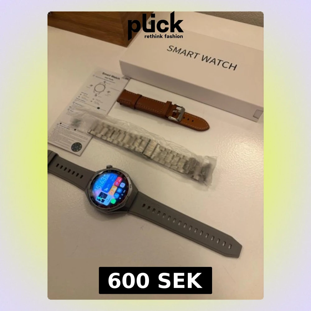 Säljer en smartwatch. Den kommer med tre olika armband: ett grått silikonarmband, ett brunt läderarmband och ett silverfärgat metallarmband. Laddare och manual ingår.