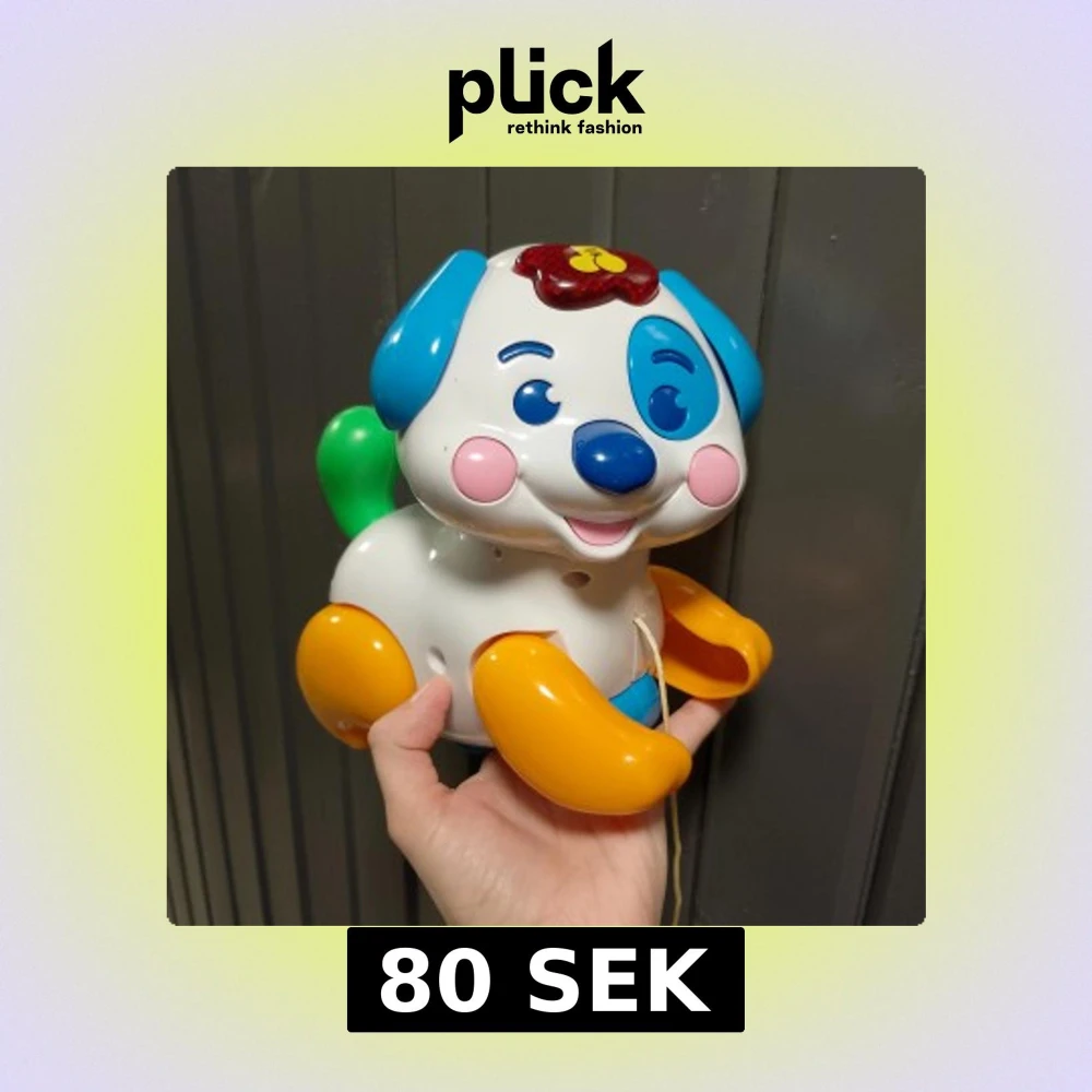 Färgglad leksakshund i plast med blå öron, orange ben och grönt svans. Produkten har en snöre för att dra den och är i gott skick utan synliga skador eller slitage. Perfekt för små barn som vill ha en rolig och interaktiv leksak.