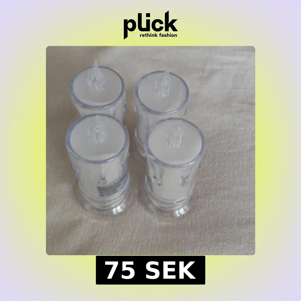 Fyra batteridrivna LED värmeljus med flammande effekt. Genomskinlig design med vit insida, på/av-knapp undertill. Perfekt för stämningsbelysning utan brandrisk. Helt ny.