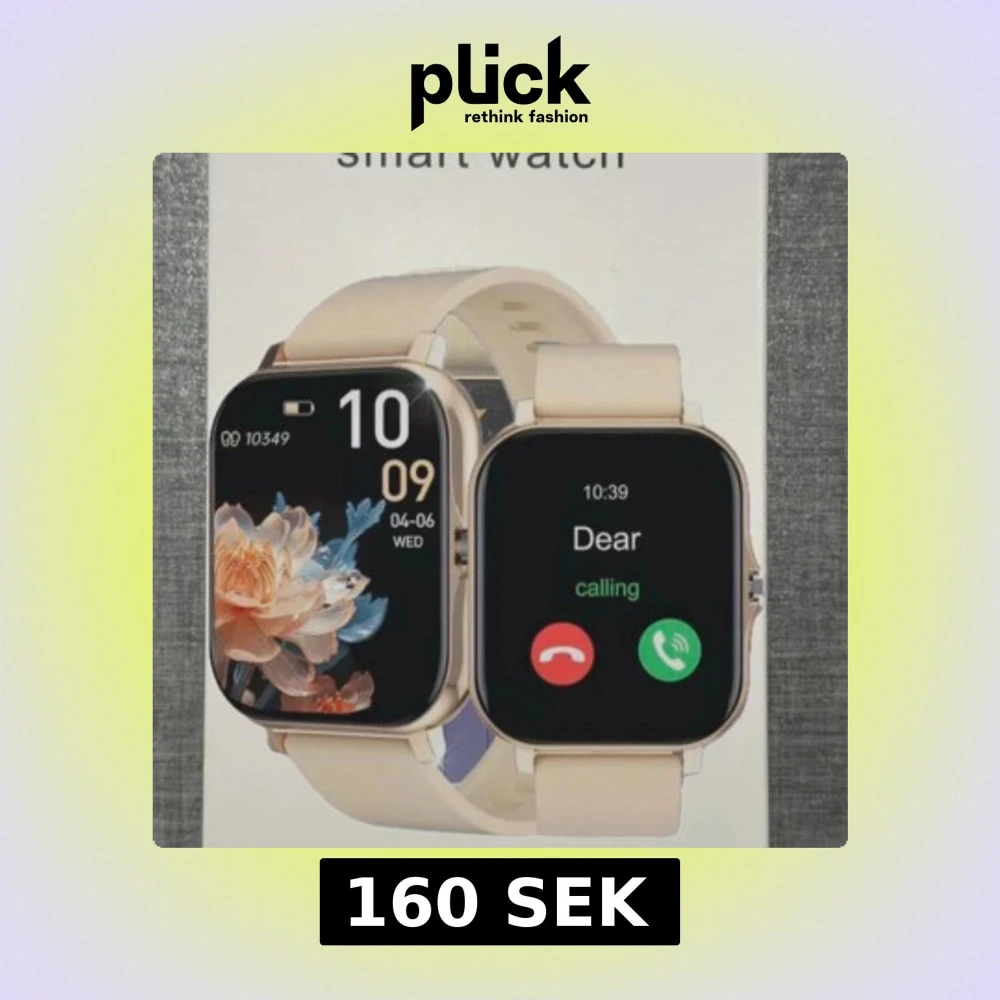 Elegant smartklocka# med stor färgskärm, stegräknare, samtalsfunktion och aktivitetsmätning. Beige silikonarmband# och modern design. Perfekt för träning och vardag#. helt ny# ut utan synligt slitage eller defekter.