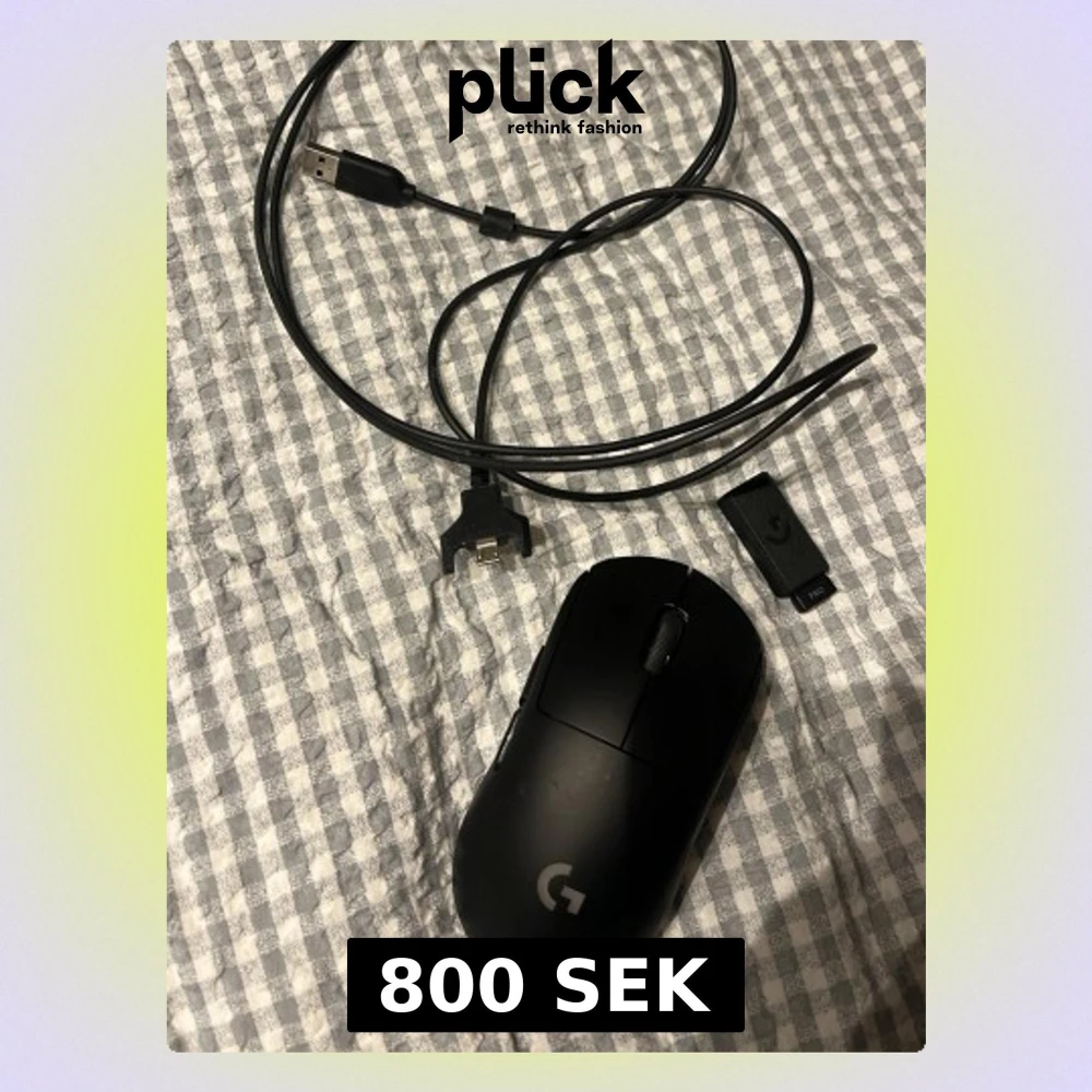 Logitech G Pro Wireless gamingmus med USB-mottagare och laddningskabel. Ergonomisk design, låg vikt och trådlös prestanda för e-sport. Nästan inga spår av användning då den inte är gammal alls. Knappt ett år gammal
