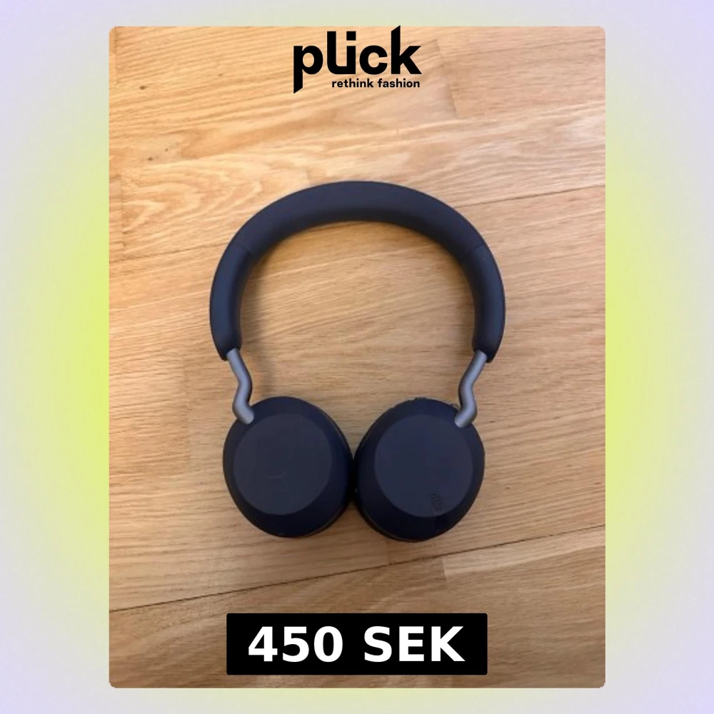 Jabra Elite 45h trådlösa over-ear hörlurar i blått. Lätta och bekväma med lång batteritid och tydliga reglage. Viss kosmetisk slitage syns på kåporna, men i övrigt gott skick. Perfekta för musik och samtal med bra ljudkvalitet. Inga tillbehör följer med!.