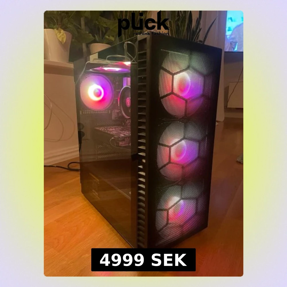 Asus stationär dator utrustad med flera RGB-fläktar för kylning och tempererat glas på sidan av chassit. Designen inkluderar frontpanel med tre stora fläktar och ytterligare fläktar inuti för optimal luftflöde. SPECS Grafikkort: Gtx 1660 CPU: Amd ryzen 5 3600 Moderkort: Asus prime B450 a k-ll CPU kylare: Amd stock kylare Nätagregat: 500w Ssd: 512gb Jag har haft datorn i 1år och 7 månader och den har fungerat riktigt bra för mig som speldator. Säljer pga uppgradering.