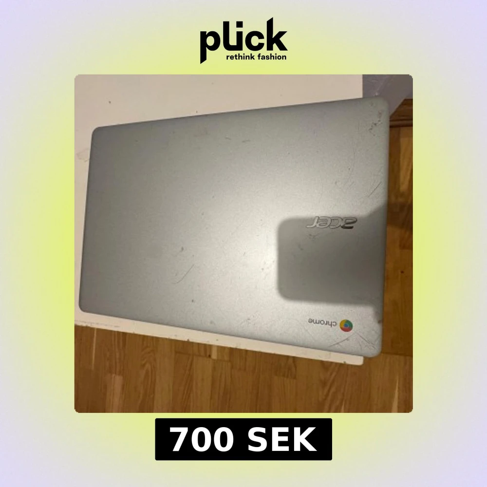 Acer Chromebook med silverfärgat chassi. Synligt slitage och repor på både ovansida och undersida, samt smuts på tangentbordet. Skärmen visar batterisymbol, vilket indikerar att laddning behövs. Perfekt för studier eller surf, säljs i befintligt skick.